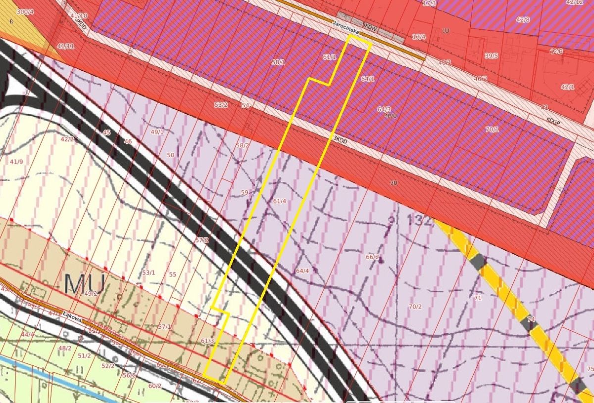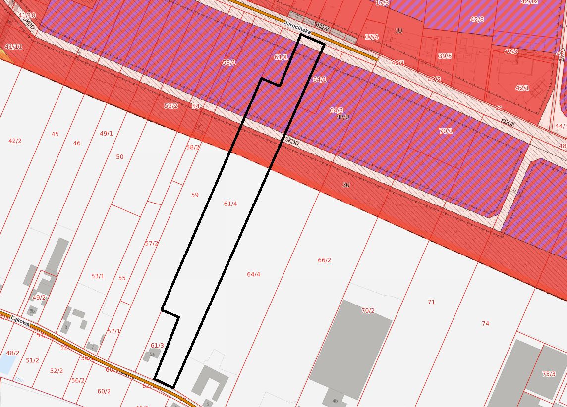 • część działki stanowiąca pas terenu poniżej terenu oznaczonego symbolem 4P/U, na głębokość około 156 m od drogi krajowej (około 0,08 ha powierzchni) jest położona na obszarze przeznaczonym pod tereny dróg publicznych klasy dojazdowej, oznaczone na rysunku planu symbolem 3KDD,